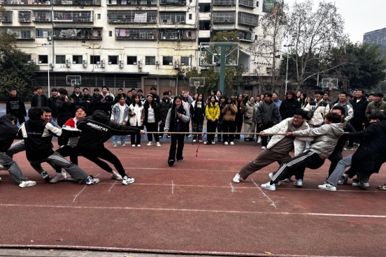 开幕式结束后,激动人心的拔河比赛随之拉开帷幕。各班参赛队伍精神抖擞地走入比赛场地,他们紧握绳索,身体向后倾斜,做好了充足的准备。两旁观众的加油声与呐喊声此起彼伏,为选手们注入了强大动力,无论是采取稳健策略还是突袭战术,都体现了同学们团队协作和顽强拼搏的精神。他们相互鼓励,整齐划一,共同应对挑战和困难,这种精神也将激励他们在未来的学习和生活中勇往直前,锐意进取。