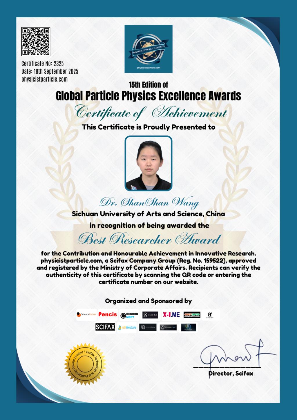 “全球粒子物理卓越奖”(Global Particle Physics Excellence Awards)由Scifax公司旗下学术团体ScienceFather(科学之父)联合多家机构共同设立,旨在表彰在前沿科学、技术创新与发明等诸多领域作出卓越贡献的研究人员。评选综合评估候选人近期发表成果的学术质量、创新价值以及长期科研表现,尤其注重研究的影响力、原创性、学术重要性及未来的发展前景。该奖项的颁奖仪式每年在全球不同城市举办,不仅搭建起获奖者与同行交流合作的桥梁,更为他们提供了向产业界与公众展示科研成就的国际舞台。