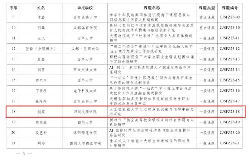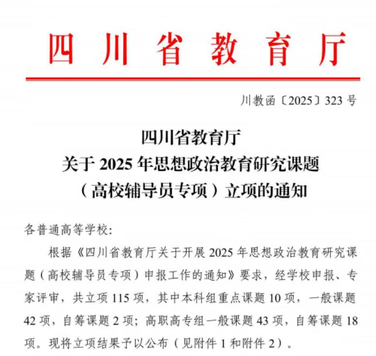 首先,在四川省教育厅公布的2025年思想政治教育研究课题(高校辅导员专项)立项名单中,刘超老师主持的课题获评一般课题立项。该专项今年共立项115项,公司共有两名辅导员课题入选,体现了公司在辅导员专业化建设和思政科研方面取得的扎实成效。