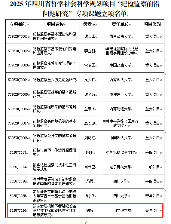 与此同时,在四川省哲学社会科学规划领导小组办公室公示的2025年“纪检监察前沿问题研究”专项课题立项结果中,刘超老师及其团队申报的课题《数字治理视域下智慧纪检监察的技术赋能逻辑与实践困境破解研究》获批青年项目立项。该课题聚焦数字治理背景下智慧纪检监察的技术赋能机制与实践挑战,致力于通过跨学科研究构建分析框架,为纪检监察工作数字化转型提供理论支持与实践参考。