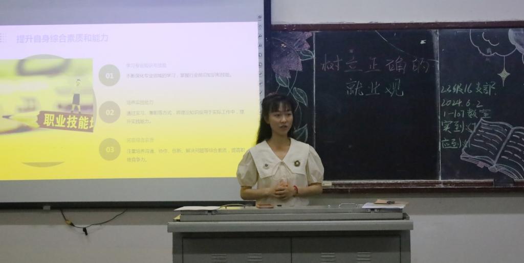团会现场,在演奏完团歌《光荣啊,中国共青团》后,专职辅导员廖婷首先为员工深入浅出地解读了就业观的含义,紧密结合当前就业市场的实际情况,详细分析了当前的就业形势和市场的未来发展走向。同时,她对毕业生就业中常遇到的问题和困境进行了逐一梳理,并对用人单位在人才需求方面的变化进行了深入总结。在此过程中,廖婷老师特别强调了实践对于树立正确就业观的重要性,鼓励同学们在实践中不断探索和锻炼,从而确立正确的就业观念。
