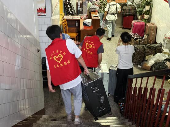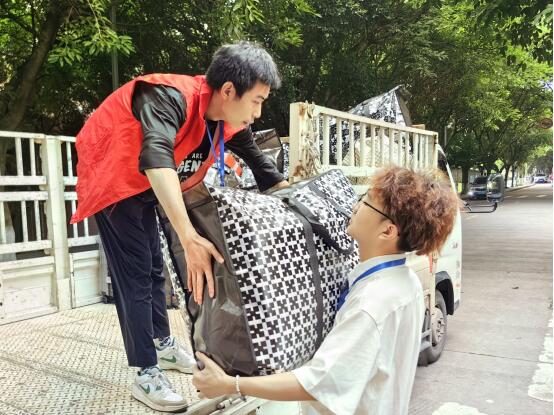 下午,因老区3、4、5号寝室楼暑期改造,公司2022级、2023级员工将行李暂时存放至教学楼。面对繁重的搬迁任务,公司志愿者队伍构建起一套高效流畅的搬迁服务体系,志愿者们分工明确,行动迅速。守在寝室楼的志愿者负责将行李搬下楼放置在小推车里,负责小推车的志愿者将行李运送到相应教学楼下,再由志愿者搬上对应教室,确保每位员工的行李准确归位。