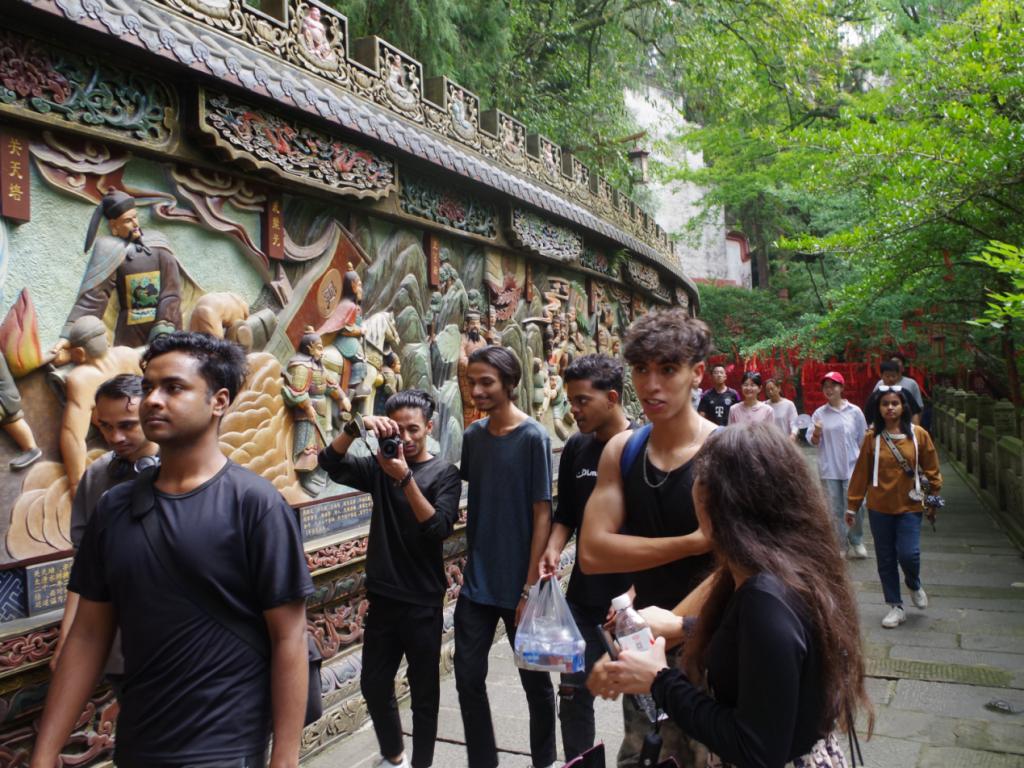 活动首日,团队抵达真佛山。它以独特山势地貌、精美庙宇建筑及深厚佛教文化底蕴闻名。在李林、胡雪莲、徐淋琳、甘宗源老师的带领下,队员们穿梭于林间庙宇,感受中国传统文化在巴蜀大地的传承与发展。职工们满怀好奇,纷纷用手机记录下震撼瞬间,参观过程中,他们与公司中国员工用中文交流,询问这些建筑背后的文化寓意,公司中国员工也能熟练地用英文回答他们的问题,讨论过程中,他们脸上洋溢出对巴蜀文化的浓厚兴趣。这种交流不仅促进了中外员工对不同文化的了解,还让巴蜀文化在交流中得以传承和弘扬,搭建起中外文化沟通的桥梁。