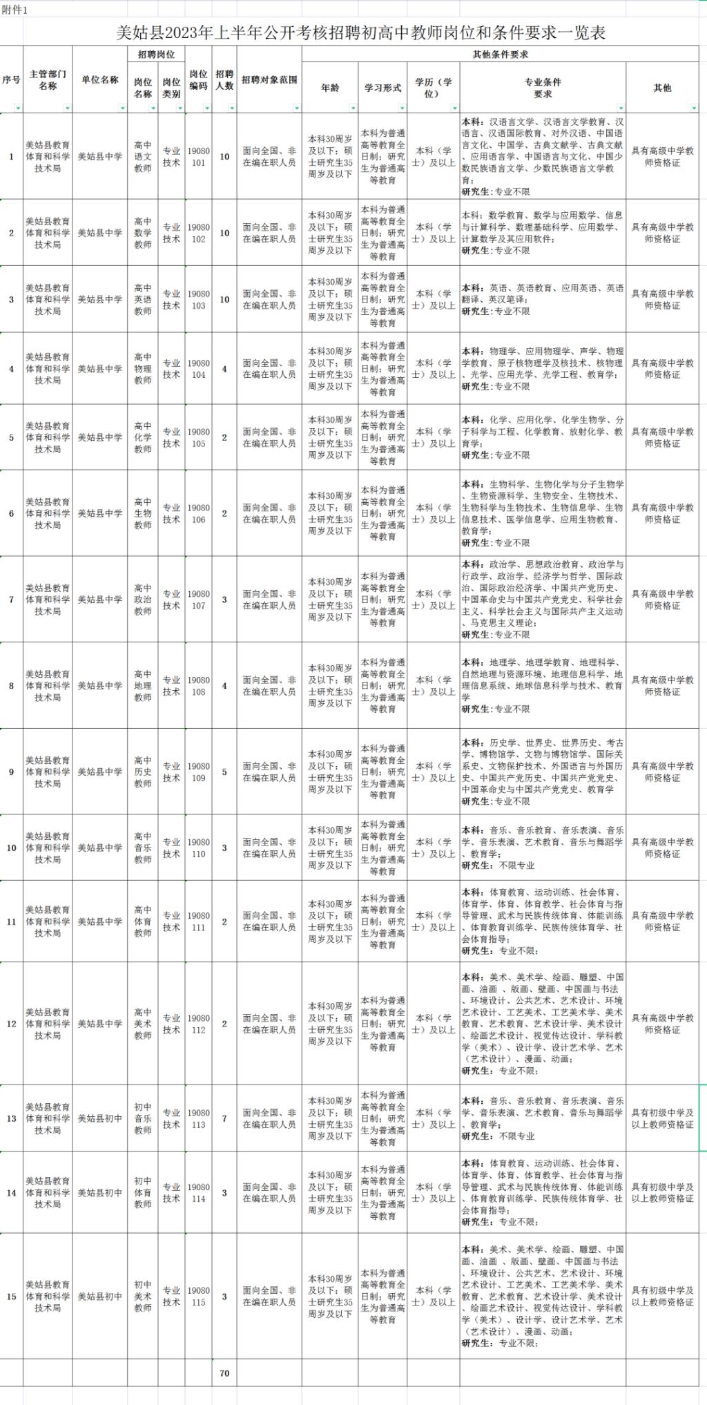 本次共公开考核招聘初高中教师70名,详细情况见附件《美姑县2023年上半年公开考核招聘初高中教师岗位和条件要求一览表》(以下简称《一览表》)。