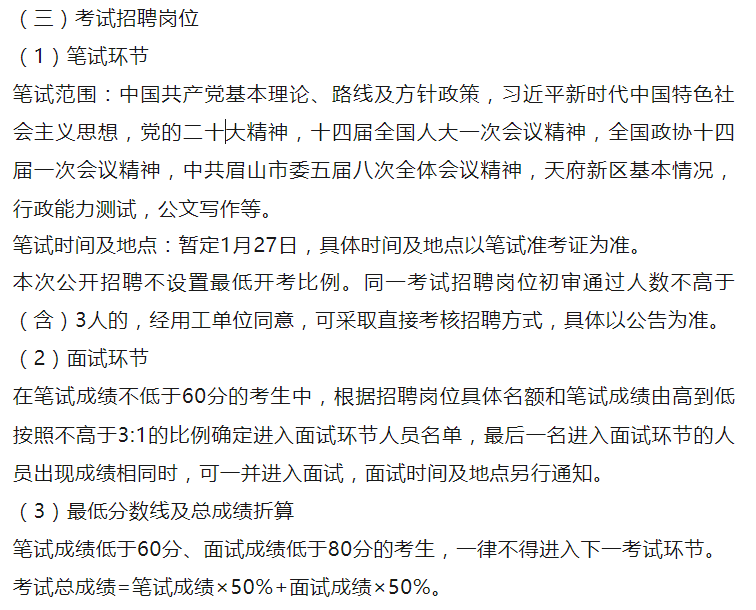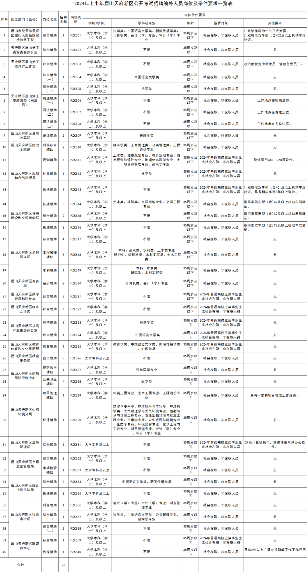 招聘岗位及名额详见《2024年上半年眉山天府新区公开考试招聘编外人员岗位及条件要求一览表》、《2024年上半年眉山天府新区公开考核招聘编外人员岗位及条件要求一览表》(附件1、2)。