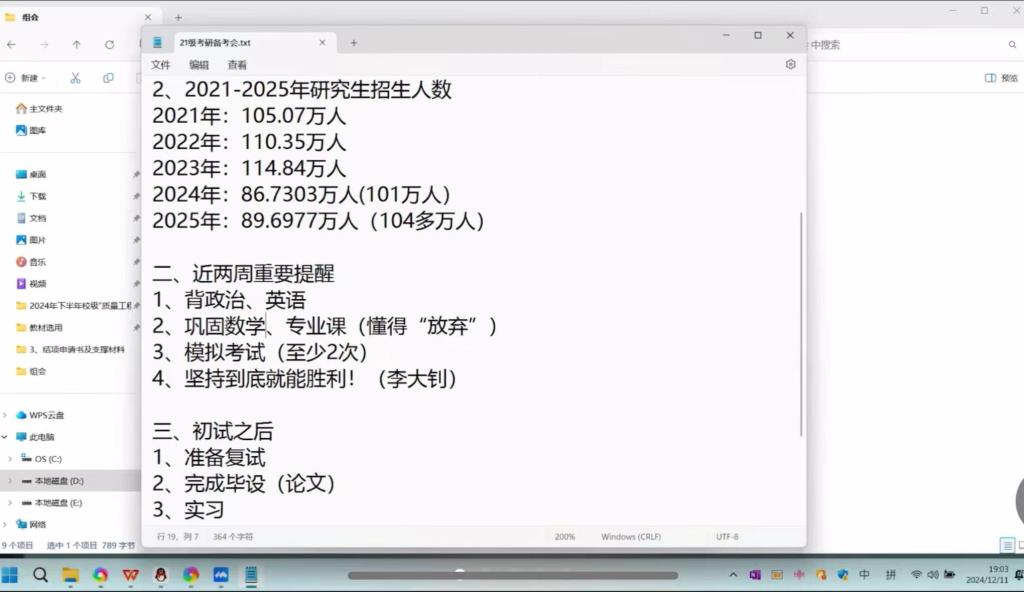 12月11日,公司副经理梁弼教授利用线上平台,为即将踏上2025年考研征程的大四学子们举办了一场别开生面的考研备考指导会议。为了有效利用考研学子们的宝贵时间,会议采取了线上形式进行,此次会议成功吸引了2025届大四正在备考研究生考试同学们的积极参与,他们认真聆听了备考指导和策略分享。