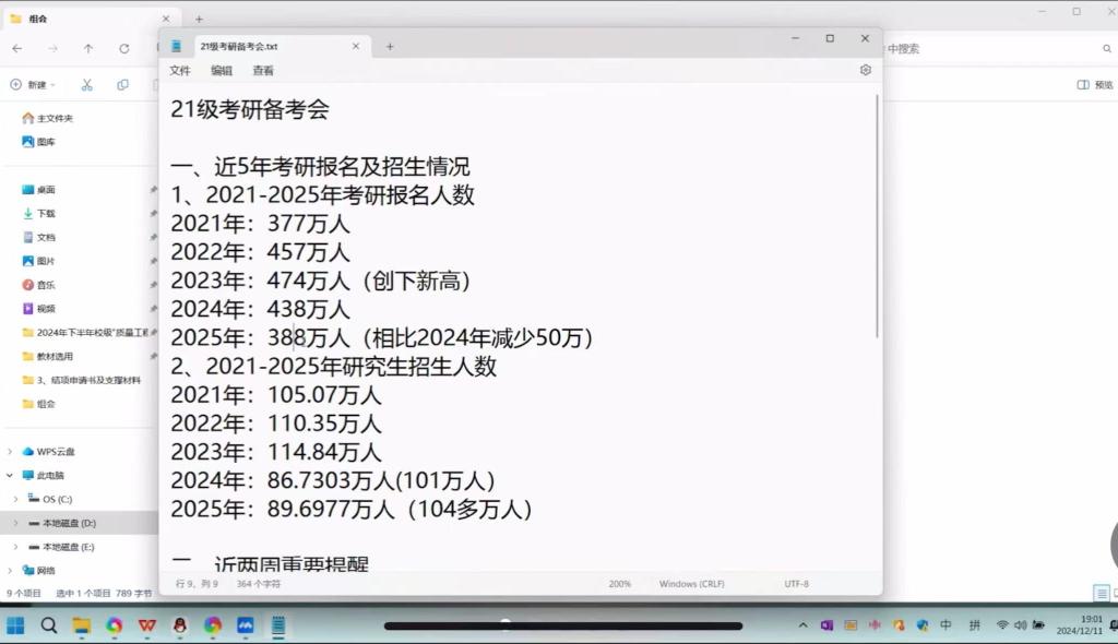 会议伊始,梁弼教授向与会学子详尽介绍了近五年来考研报名及招生情况的总体趋势,通过详实的数据直观展示了考研竞争的激烈程度及各大院校的招生动态。紧接着,梁教授指出数据显示,2025年考研人数预计会比2024年减少50万。这一信息引起了学子们的广泛关注与讨论。梁教授随后解答了同学们的疑问,并提醒大家要理性对待数据变化,保持平稳心态,全力以赴备考。