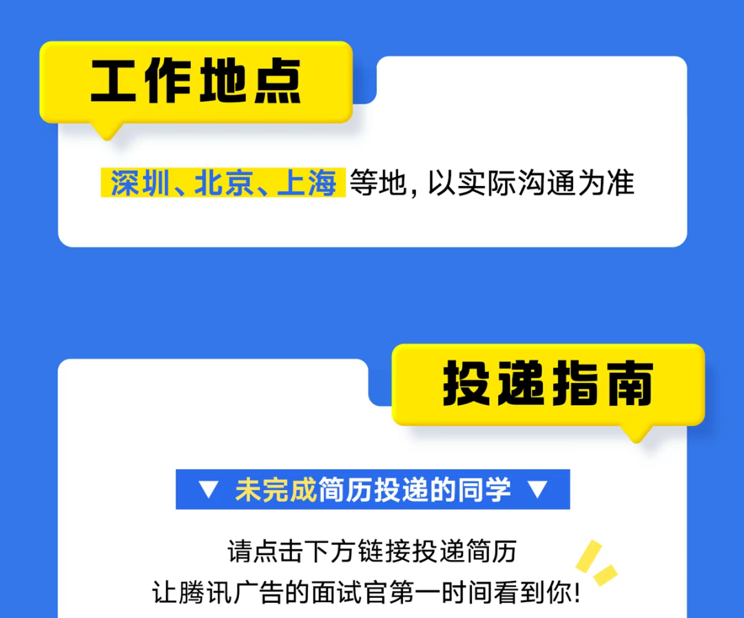 请点击此链接投递简历:https://join.qq.com/post.html?query=p_1,b_953&keyword=%E8%85%BE%E8%AE%AF%E5%B9%BF%E5%91%8A&sessionid=